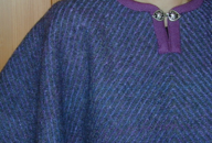 The cape shown here came about after studying the shape and lines of a lotus leaf. The veining of the leaf inspired the twill lines, while the overall shape of the cape reflects the leaf shape. The original cape was woven with various naturally dyed green yarns, while this uses yarn blended from red violet to blue violet.